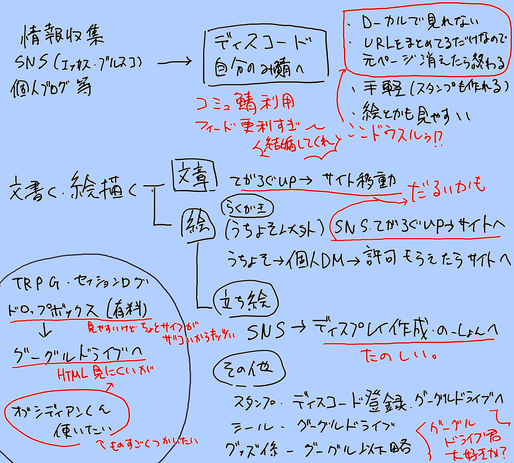 うーん、こうやってみると無駄が多いな…割とすぐ見て!!って気持ちが強いのとSNSのがやっぱり書いたよ、お宅のキャラ借りましたよ!が伝えやすいのが強い。面倒でもこの形を維持すべきなんだろうか。でもサイトに一枚だけ絵をぽーん!って投げるよりは何枚かまとめて見せれるようにしたい派なので(一枚だけぽーんをするととんでもない枚数になるから)やっぱりちょこ出しからのサイトまとめのがいいんかな?という気持ち。うちよそ絵は描いたらそれぞれの個人DMとか、自陣なら自陣鯖に放り込んでるから見せたい人には見せれてる環境ではあるんだよなぁ。創作絵なんかは別にみられなくても私が楽しけりゃそれでいいのでこの辺りはサイト直でもいいかな。